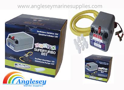 Bravo superturbo bst inflatable boat pump. Automatic cut off when chosen pressure is reached-Powerful airflow 450L per min-Features brass gearing in a turbine and piston pump-Pressure selectable by rotary dial - up to 11.7psi-Supplied with cable with 2 crocodile clips, carry bag, hose-and mutiple connectors-Ideal for fast inflation of inflatable dinghies, water toys and tubes. High pressure performance-ideal for inflating air rib floors to correct pressure-Inflates & deflates.